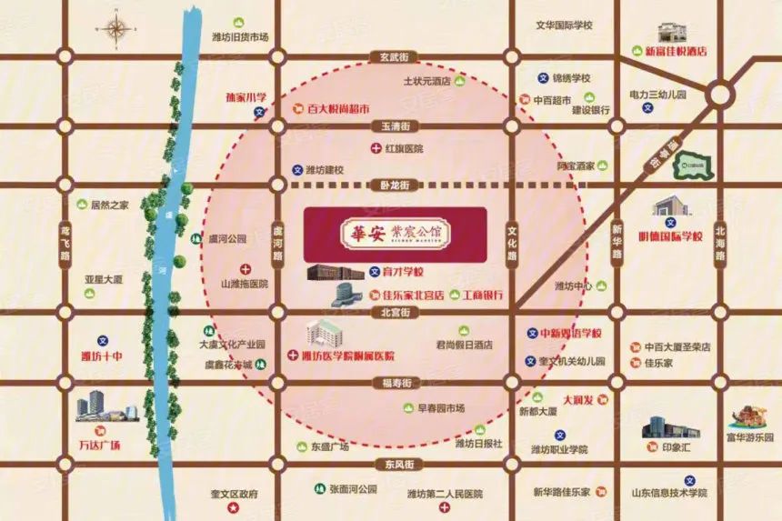 項目地處濰坊東西主干道北宮街與文化路交匯處向北200米路西,占據(jù)濰坊主城區(qū)奎文核心位置,處于濰坊城心之上。