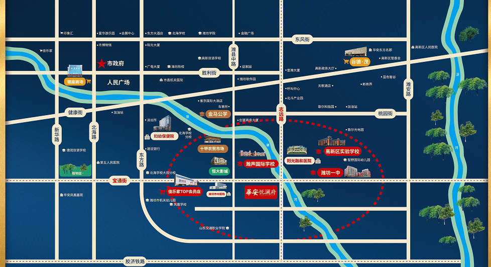 項目處于濰坊高新區(qū)核心區(qū)域—寶通街志遠路交匯處,西臨濰縣中路主干道,地處行政商務(wù)區(qū)、文教醫(yī)養(yǎng)區(qū)、生態(tài)休閑區(qū)三大輻射圈的交匯處,是濰坊的商業(yè)、金融、政治、休閑中心,地理位置環(huán)境非常優(yōu)越。